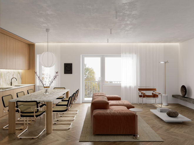 Основною метою цього проєкту було перетворити 3 кімнати на 2, а також створити індивідуальну гардеробну та модуль для зберігання, щоб оптимізувати простір. Нова кухня тепер переходить у відкриту вітальню, де теплі відтінки дерева в поєднанні з мармуром можна побачити на обідньому столі, кухонних шафах та декоративних предметах. Вибір мінімалістичних меблів та м’яких кольорів переносять нас у природну та спокійну атмосферу.